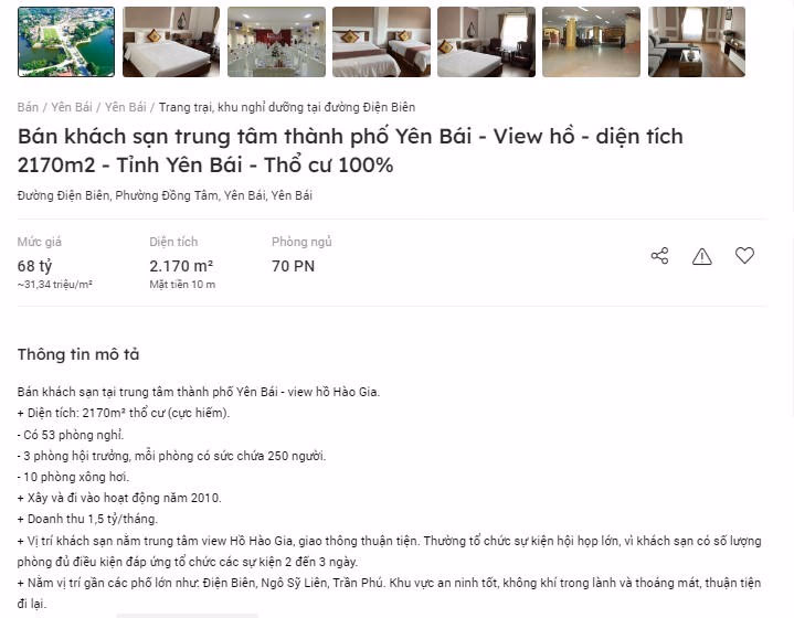 Tại Yên Bái cũng đang rao bán một khách sạn trung tâm thành phố Yên Bái với view hồ, diện tích lên tới 2170m2. Toàn bộ khách sạn này là đất thổ cư 100% với 70 giường ngủ. Giá rao bán là 68 tỷ đồng.
