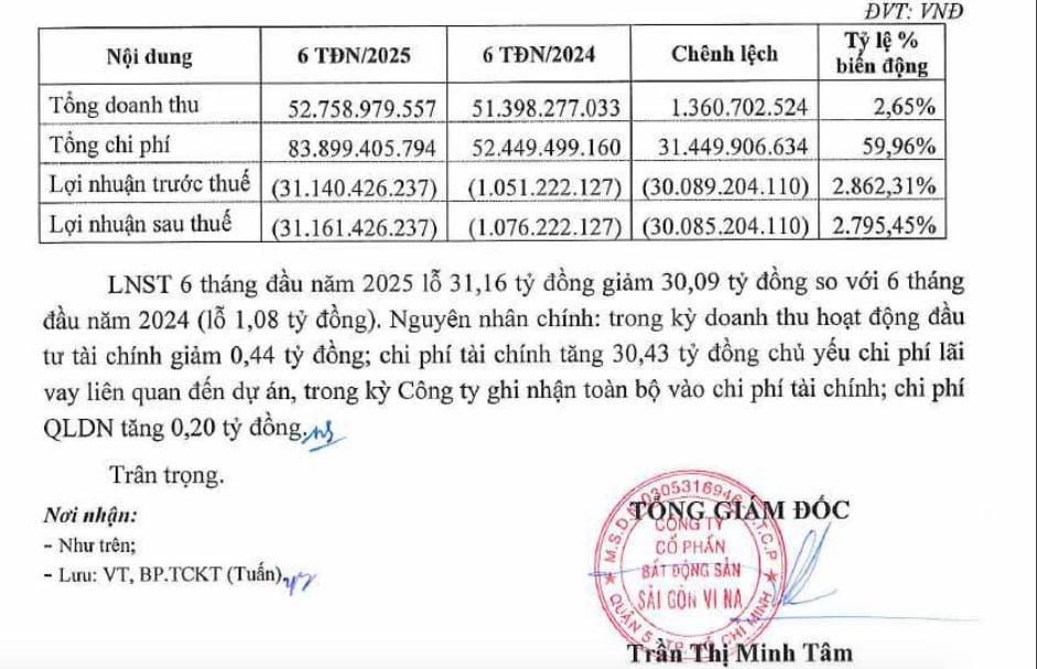 Theo báo cáo tài chính giữa niên độ đã được soát xét cho kỳ kế toán 6 tháng kết thúc ngày 30/6/2025 do Công ty cổ phần Bất động sản Sài Gòn Vi Na (Land Sai Gon) công bố, tổng doanh thu 6 tháng đầu năm 2025 của Land Sai Gon đạt hơn 52,7 tỷ đồng, tăng 2,65% so với cùng kỳ năm ngoái.