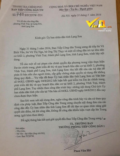 | Liên quan đến khiếu nại về chính sách hỗ trợ, bồi thường cho một số hộ dân ở phường Vĩnh Trại, TP Lạng Sơn, ngày 31/5/2016, Ban tiếp dân của Thanh tra Chính phủ đã có văn bản số 740 yêu cầu UBND tỉnh Lạng Sơn chỉ đạo các cơ quan chức năng giải quyết dứt điểm, trả lời công dân, không để công dân khiếu kiện vượt cấp lên Trung ương. |