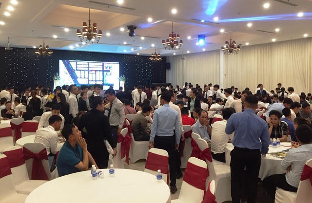 Bên trong trung tâm hội nghị là buổi mở bán đất nền của Công ty Công ty CP Đầu tư Xây dựng và Phát triển Hoàng Hưng Thịnh . Ảnh: Đại Việt