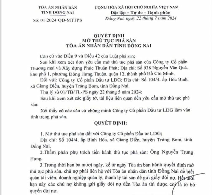 Theo đó, ngày 22/7/2024, Tòa án Nhân dân tỉnh Đồng Nai đã ban hành Quyết định số 01/2024/QĐ-MTTPS về việc mở thủ tục phá sản đối với Công ty Cổ phần Đầu tư LDG. Thẩm phán phụ trách tiến hành thủ tục phá sản là ông Nguyễn Trung Hưng.