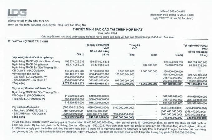 Cùng với đó, số vay và nợ thuê tài chính ngắn hạn ghi nhận hơn 1.000 tỷ đồng, trong đó vay tại Ngân hàng Thương mại Cổ phần Việt Nam Thịnh Vượng (VPBank) với số tiền gần 200 tỷ đồng. Ngân hàng TMCP Đông Nam Á (SeABank) gần 66 tỷ đồng. Ngân hàng TMCP Sài Gòn Thương Tín (Sacombank) – Chi nhánh Quận 11 là 147 tỷ đồng. Mặt khác, vay dài dạn đến hạn trả tại Ngân hàng TMCP Sài Gòn Thương Tín – Chi nhánh Quận 11 là gần 300 tỷ đồng. Trái phiếu LDGH2123002 là hơn 366 tỷ đồng.