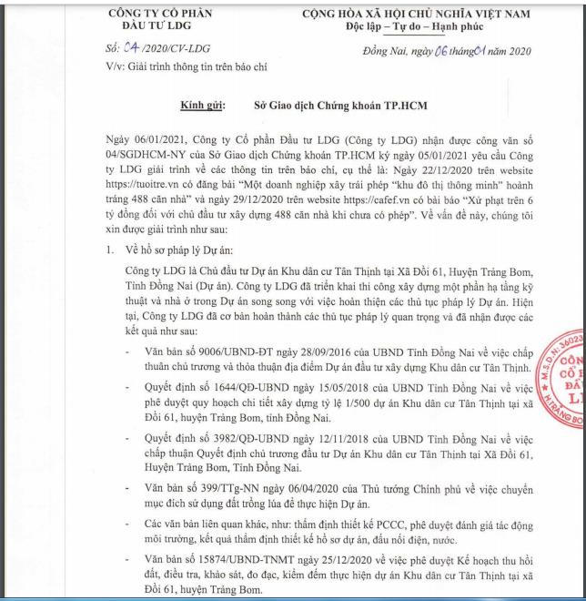 Công ty Cổ phần Đầu tư LDG (Mã ck: LDG) vừa có văn bản giải trình về những thông tin xây dựng trái phép gần 500 căn nhà tại dự án khu dân cư Tân Thịnh tại Xã Đồi 61, huyện Trảng Bom, tỉnh Đồng Nai.