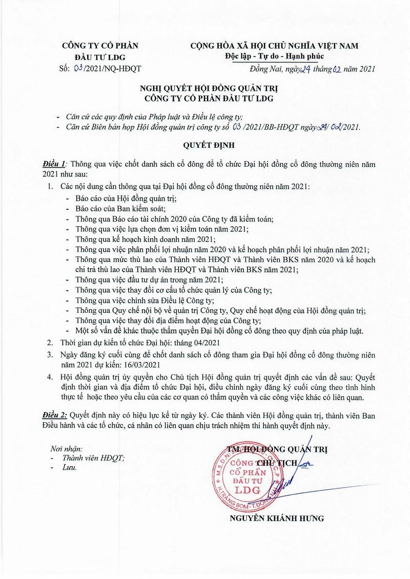 Theo dự kiến ĐHĐCĐ thường niên lần 1 năm 2021 của CTCP Đầu tư LDG (mã LDG) sẽ được tổ chức vào ngày 15/4/2021. Tuy nhiên sự kiện đã phải hủy bỏ do không đủ điều kiện tổ chức.