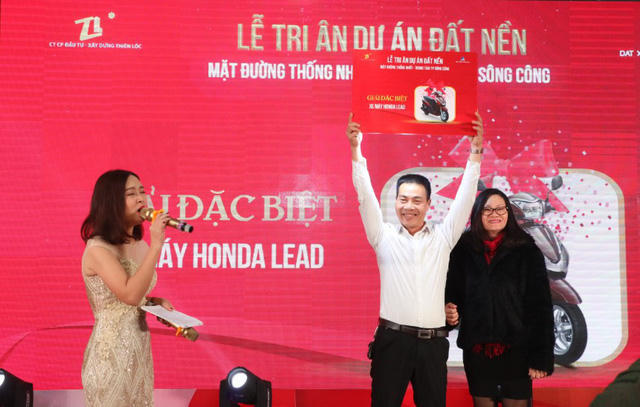 Là một trong những khách hàng may mắn nhất trúng giải, anh Nguyễn Minh Đức(Từ Sơn, Bắc Ninh) đặt mua lô BL08-860 đã trở thành chủ nhân may mắn nhận giải đặc biệt 01 xe Honda Lead trị giá 40 triệu đồng. Anh Đức cho biết: “Niềm vui đến quá bất ngờ nên đến giây phút nhận giải tôi vẫn không tin là mình đã trúng giải đặc biệt. Tôi ở Bắc Ninh, chọn dự án đất nền Sông Công để đầu tư một phần vì tiềm năng của mảnh đất này, một phần vì cảm thấy có duyên với Thái Nguyên, cũng chưa bao giờ nghĩ mình sẽ nhận được lộc to như thế này. Tôi quyết định sẽ đầu tư thêm vài lô đất nữa tại dự án để “nhân” thêm nhiều lộc.”(cười)