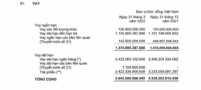 Do tăng cường hoạt động vay nợ nên tổng số dư nợ vay tại KBC tại thời điểm ngày 31/3/2022 ghi nhận hơn 7.220 tỷ đồng, chiếm gần 50% nợ phải trả.