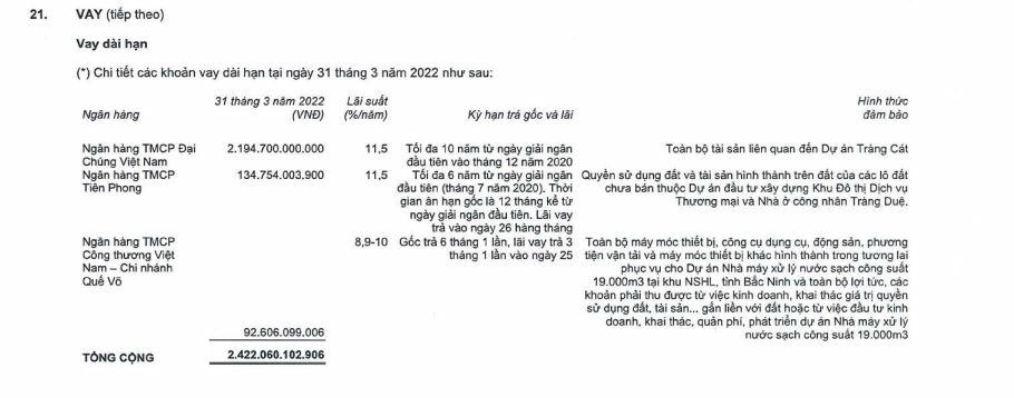 Ngoài ra, Kinh Bắc đang vay dài hạn tại ngân hàng hơn 2.422 tỷ đồng. Trong đó ngân hàng PVComBank cho vay nhiều nhất với 2.194 tỷ đồng, ngân hàng TPBank cho vay gần 135 tỷ đồng và ngân hàng Vietinbank cũng cho vay hơn 92 tỷ đồng. Lãi suất dao động từ 8,9% đến 11,5%/năm.