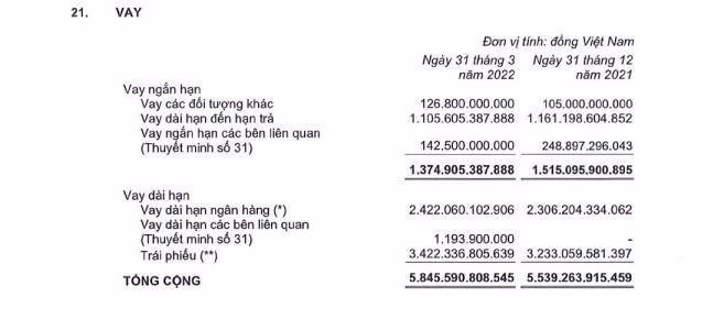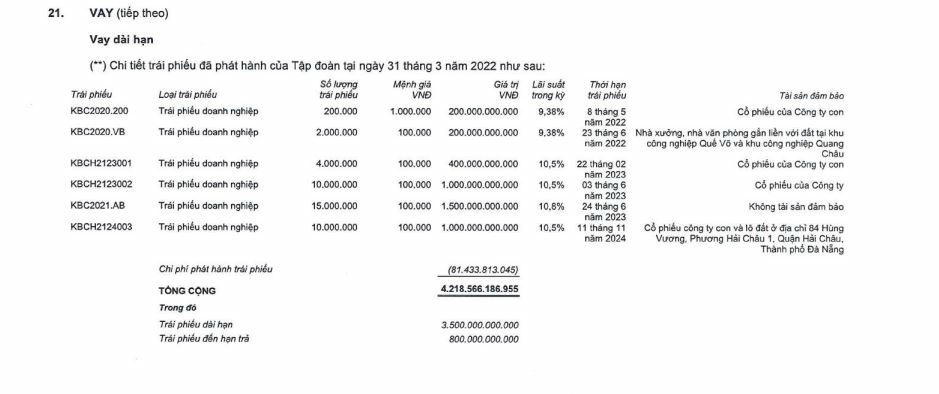 Đáng lưu ý, dư nợ vay dài hạn tại Kinh Bắc chủ yếu xuất phát từ trái phiếu với hơn 4.218 tỷ đồng. Các lô trái phiếu của Đô thị Kinh Bắc có lãi suất từ 9,38% đến 10,8%. Trong đó trái phiếu đến hạn trả tính đến 31/3/2022 ghi nhận 800 tỷ đồng