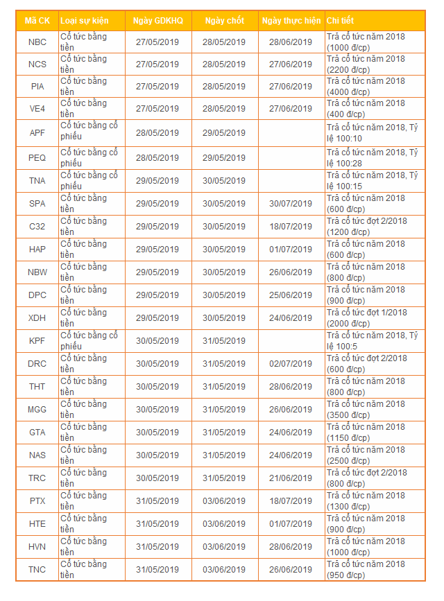 Lịch chốt quyền cổ tức 27-31/5
