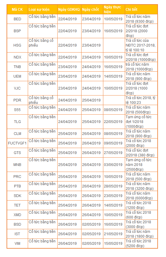 Lịch chốt quyền cổ tức tuần 22-28/4