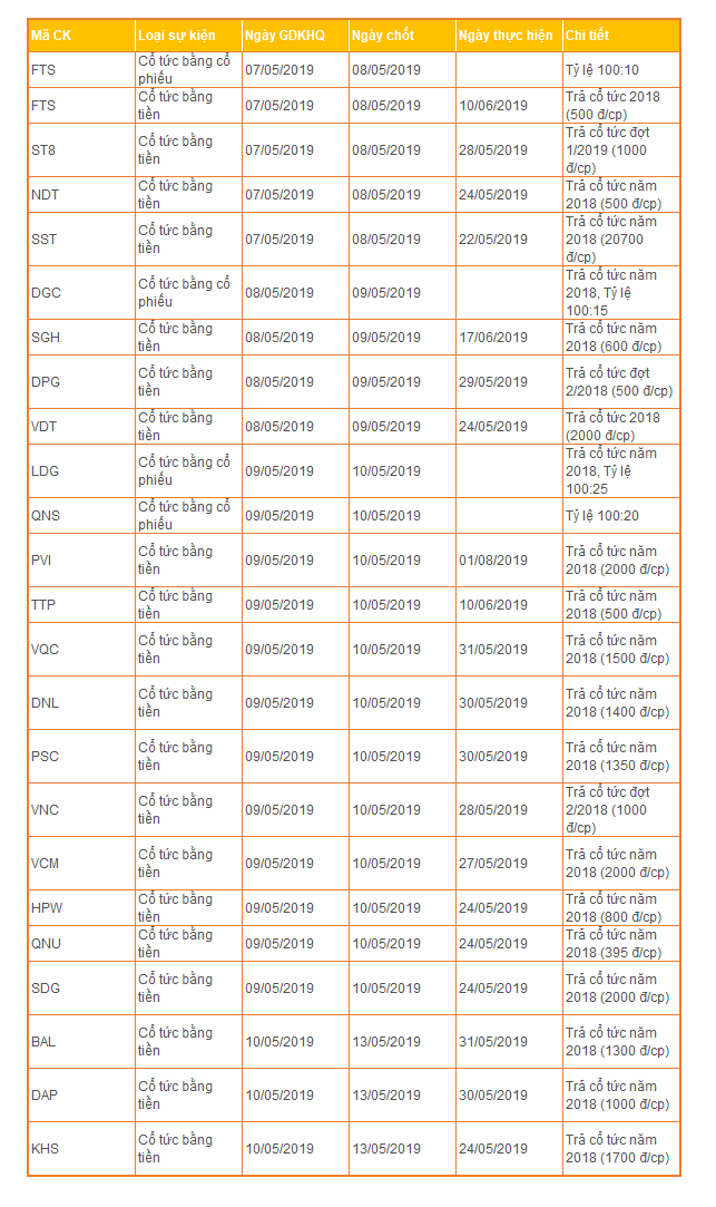 Lịch chốt quyền cổ tức tuần 6-10/5