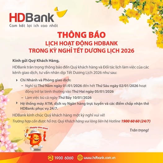 HHDBank thông báo nghỉ Tết Dương lịch từ 1/1/2026 - 2/1/2026