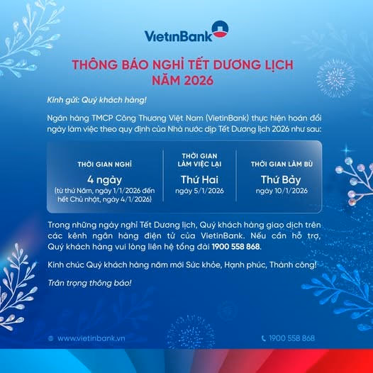 VietinBank thông báo việc hoán đổi ngày làm việc bù vào 10/1/2026