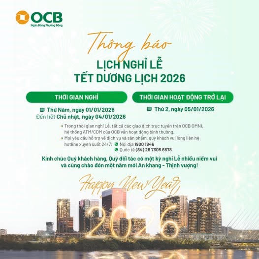 OCB thông báo lịch nghỉ Tết dương lịch 2026 từ 1/1/2026 - 4/1/2026