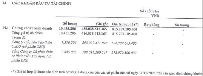 Cũng tại thời điểm 31/12/2021 – thời điểm kết thúc năm 2021 Licogi 14 tạm tính giá trị số chứng khoán DIG và CEO đang nắm giữ có giá trị hợp lý hơn 815 tỷ đồng. Giá trị hợp lý này được tính trên cơ sở giá đóng cửa của các cổ phiếu này tại ngày 31/12/2021. Như vậy nếu “tất tay” chốt lãi, Licogi 14 sẽ ghi nhận số lãi xấp xỉ 330 tỷ đồng cho khoản đầu tư chứng khoán này.