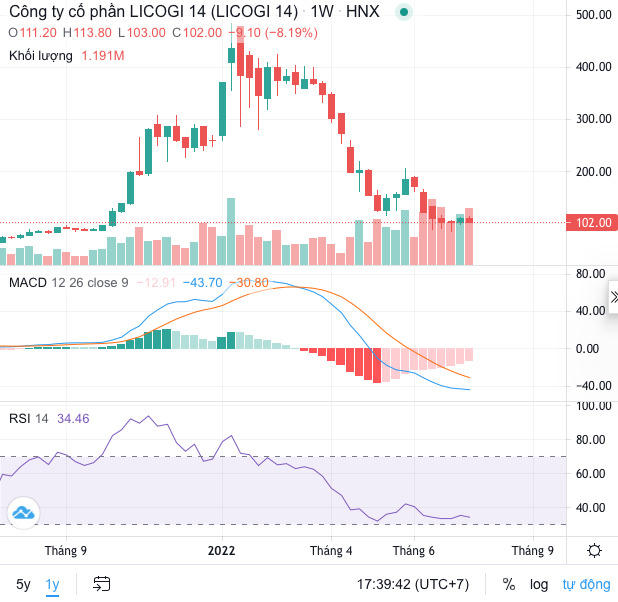 Không những kinh doanh thua lỗ do đầu tư chứng khoán, cổ phiếu L14 của Licogi 14 cũng lao dốc từ vùng đỉnh 440.000 đồng/cổ phiếu, mất đi gần 80% giá trị.