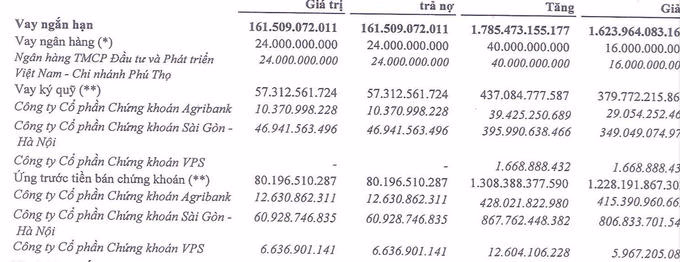 Tổng tiền "vay ký quỹ" trong năm đối với Chứng khoán Sài Gòn Hà Nội (SHS) hơn 395 tỷ đồng và trả trong năm 349 tỷ đồng, còn dư lại cuối năm gần 47 tỷ đồng. Khoản vay ký quỹ đối với Chứng khoán Agribank trong năm hơn 39 tỷ đồng và trả trong năm 29 tỷ đồng, còn dư cuối năm hơn 10 tỷ đồng. Đối với chứng khoán VPS vay ký quỹ trong năm hơn 1,6 tỷ đồng và đã trả hết trong năm.