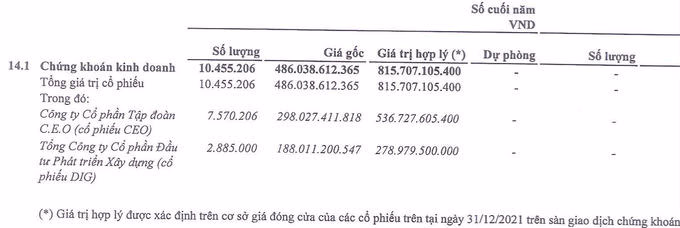 Quay trở lại bản báo cáo lưu chuyển tiền tệ, tổng tăng tiền chứng khoán kinh doanh trong năm đạt hơn 486 tỷ đồng, trong khi số dư đầu năm 2021 bằng 0. Đây chính là khoản đầu tư vào cổ phiếu CEO của Tập đoàn C.E.O và cổ phiếu DIG của DIC Corp. Báo cáo ghi nhận công ty sở hữu hơn 7,57 triệu cổ phiếu CEO và gần 2,89 triệu cổ phiếu DIG với giá trị đầu tư gốc hơn 486 tỷ đồng. Giá trị hợp lý xác định theo giá đóng cửa cổ phiếu tại ngày 31/12/2021 đạt hơn 815 tỷ đồng, tương ứng chênh lệch “tạm lãi” khoảng 330 tỷ đồng.