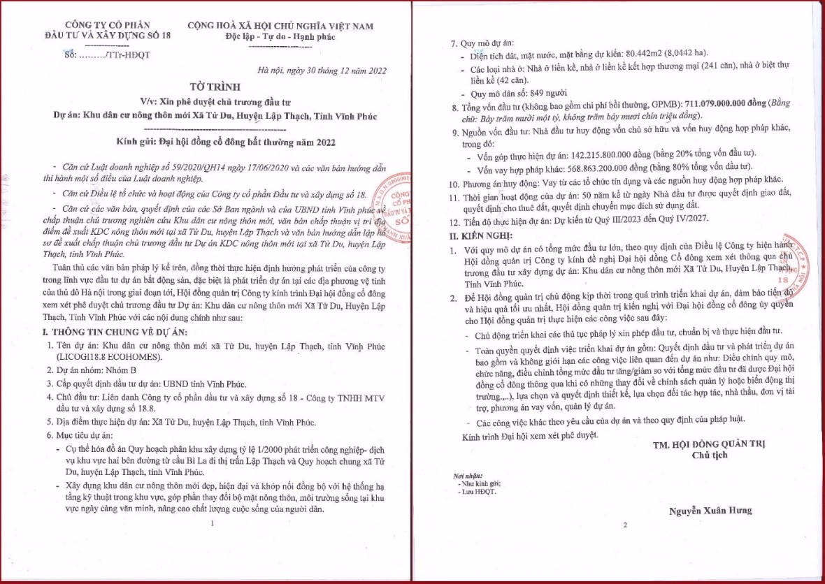 L18 trình cổ đông về việc đầu tư hai dự án 1.360 tỷ đồng