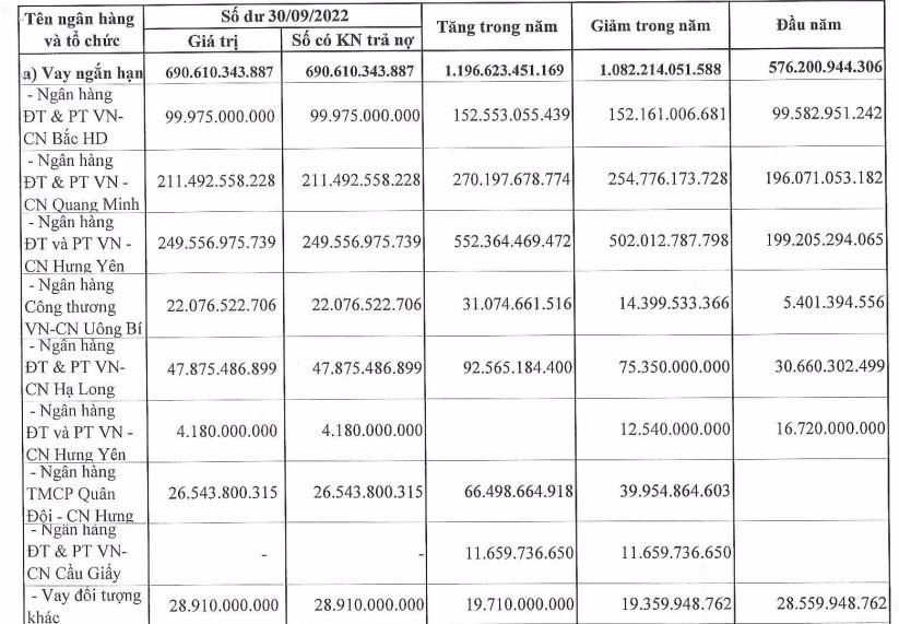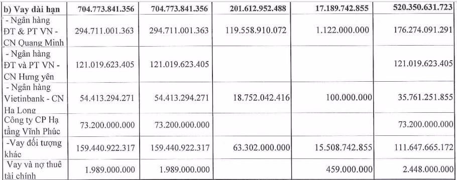 Trong khi đó, khoản vay dài hạn đáng chú ý cũng được thực hiện tại Ngân hàng BIDV – chi nhánh Quang Minh với số tiền 294,7 tỷ đồng; khoản vay tại BIDV – Chi nhánh Hưng Yên với số tiền 121 tỷ đồng và khoản vay Công ty Cổ phần Hạ tầng Vĩnh Phúc 73,2 tỷ đồng.