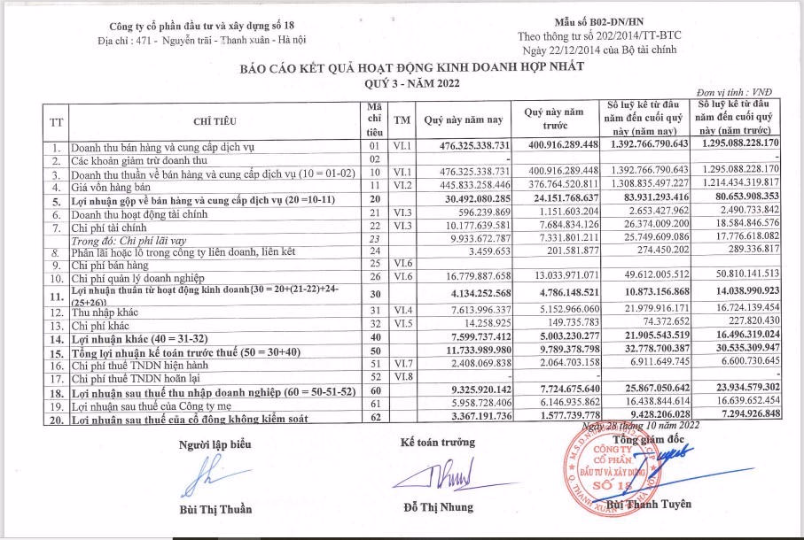 Lũy kế 9 tháng đầu năm, Licogi 18 ghi nhận doanh thu đạt 1.392,8 tỷ đồng (tăng 7,5% so với cùng kỳ năm 2021). Lợi nhuận sau thuế ghi nhận ở mức 25,9 tỷ đồng (tăng 8,3% so với cùng kỳ).