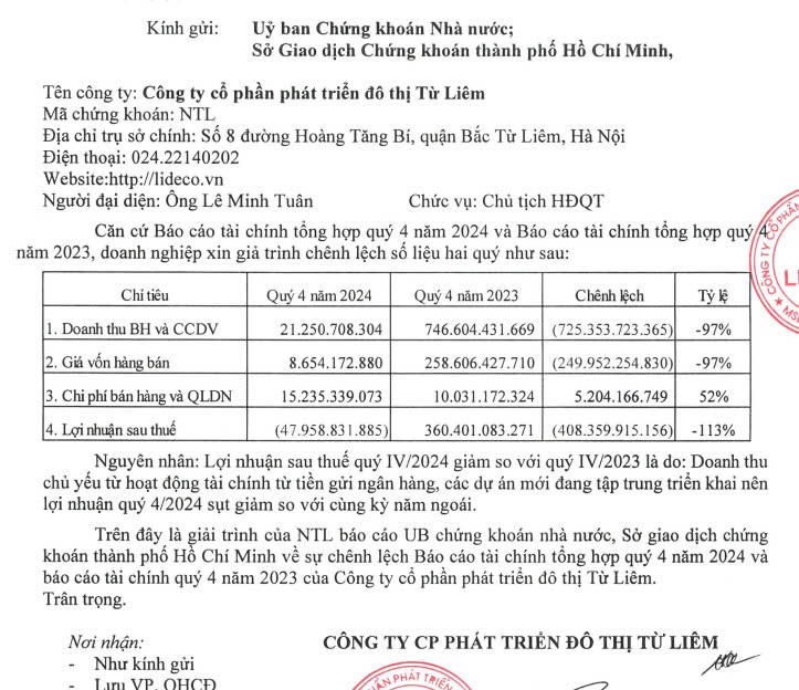 | Công văn giải trình chênh lệch BCTC Tổng hợp quý 4/2024 của Lideco |