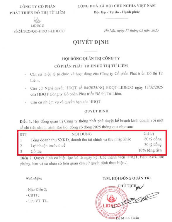 Tháng 1/2025, Công ty Cổ phần Phát triển đô thị Từ Liêm (Lideco) công báo báo cáo tài chính với mức doanh thu 1.441 tỷ đồng, tăng 57,6% so với năm trước, lợi nhuận trước thế đạt 840 tỷ đồng, gần gấp đôi so với cùng kỳ. Dù vậy, bước sang năm 2025, Lideco lại lên kế hoạch lợi nhuận năm 2025 thấp nhất lịch sử hoạt động.