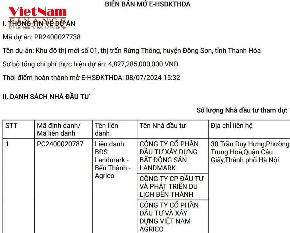 Liên danh Công ty cổ phần Đầu tư xây dựng bất động sản Landmark (Hà Nội), Công ty cổ phần Đầu tư và phát triển Du lịch Bến Thành (TP. Hồ Chí Minh), Công ty CP đầu tư và Xây dựng Việt Nam Agrico là nhà đầu tư duy nhất đăng ký thực hiện dự án Khu đô thị mới số 01, Thị trấn Rừng Thông, huyện Đông Sơn, tỉnh Thanh Hóa.