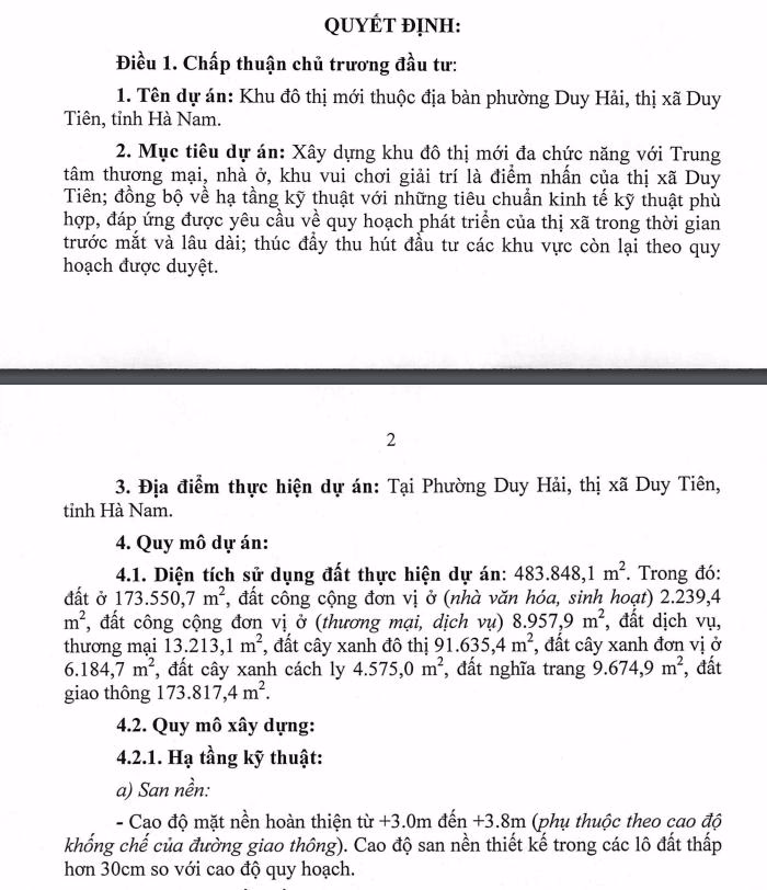 Vừa qua, UBND tỉnh Hà Nam đã phê duyệt quy hoạch chi tiết xây dựng tỉ lệ 1/500 khu đô thị mới thuộc địa bàn phường Duy Hải thị xã Duy Tiên. Theo đó, chủ đầu tư của dự án này là liên danh CTCP Thương mại Ngôi Nhà Mới, CTCP Đầu tư Phát Triển đô thị Đại Việt và CTCP Đầu tư Phát triển hạ tầng Long – Lands.