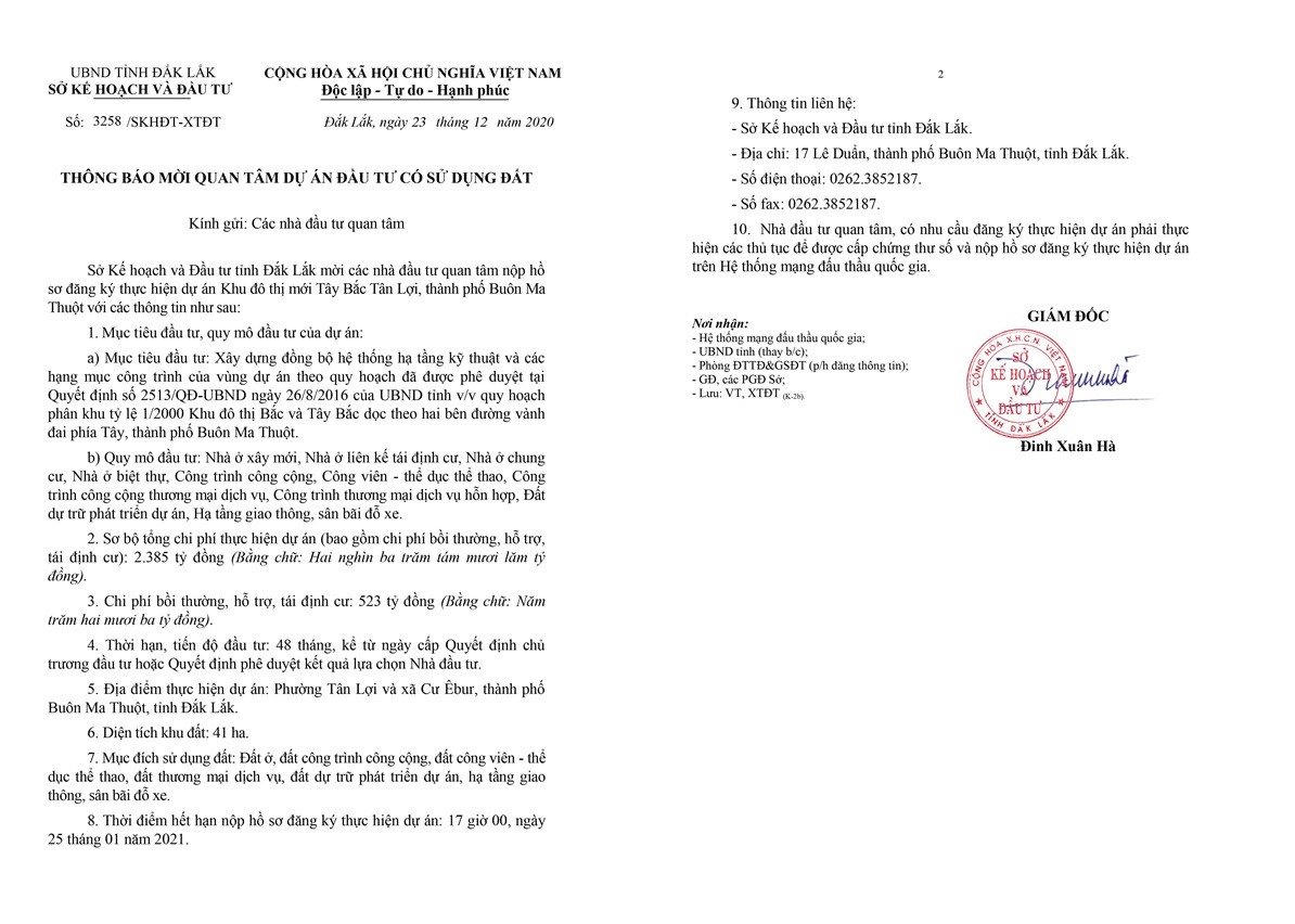 Vừa qua Sở Kế hoạch và Đầu tư tỉnh Đắk Lắk có văn bản thông báo mời các nhà đầu tư quan tâm nộp hồ sơ đăng ký thực hiện dự án Khu đô thị mới Tây Bắc Tân Lợi, thành phố Buôn Ma Thuột.
