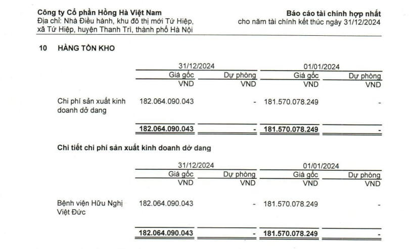Đáng chú ý, hàng tồn kho của CTCP Hồng Hà Việt Nam đến cuối năm 2024 ghi nhận hơn 182,06 tỷ đồng. Theo mô tả thuyết minh thì hàng tồn kho được ghi nhận nằm ở chi phí sản xuất kinh doanh dở dang liên quan tới Bệnh viện Hữu Nghị Việt Đức.
