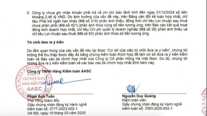 Đáng chú ý, kiểm toán viên của Công ty TNHH Hãng kiểm toán AASC đã từ chối đưa ra ý kiến kiểm toán về các báo cáo tài chính hợp nhất của CTCP Hồng Hà Việt Nam năm 2024.