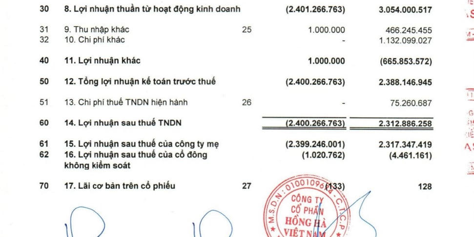 Sau khi trừ đi các chi phí, kết thúc năm 2024, CTCP Hồng Hà Việt Nam ghi nhận khoản lỗ sau thuế hơn 2,4 tỷ đồng; trong khi cùng kỳ năm ngoái báo lãi hơn 2,3 tỷ đồng.