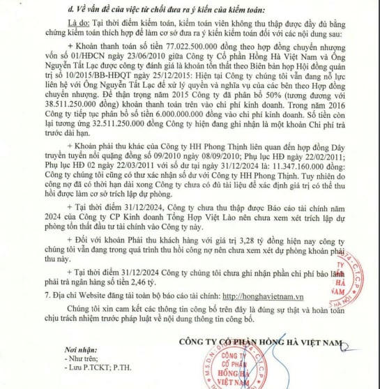 Cùng với đó, CTCP Hồng Hà Việt Nam cũng cho biết tại thời điểm 31/12/2024, công ty chưa thu thập được báo cáo tài chính năm 2024 của CTCP Kinh doanh Tổng hợp Việt Lào nên chưa xem xét trích lập dự phòng tổn thất đầu tư tài chính vào công ty này.