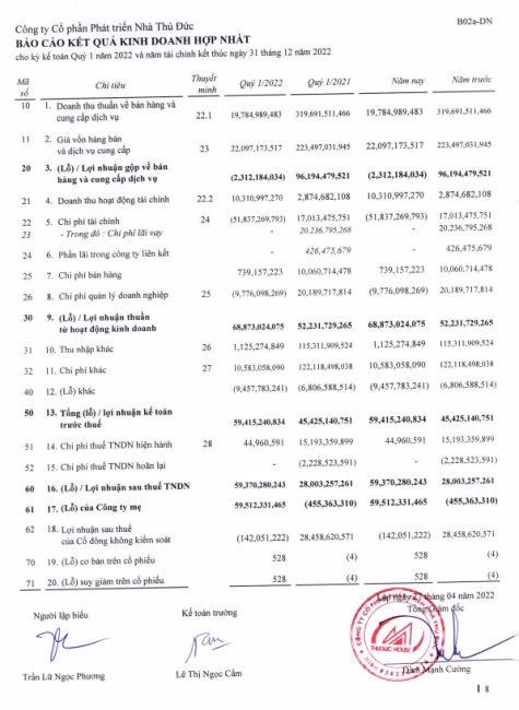 Xét về tình hình kinh doanh, quý I vừa qua, Thuduc House đạt doanh thu chỉ 20 tỷ đồng, giảm hơn 90% so với cùng kỳ 2021 nhưng lợi nhuận lên tới gần 60 tỷ đồng nhờ nghiệp vụ hoàn nhập dự phòng giảm giá các khoản đầu tư.