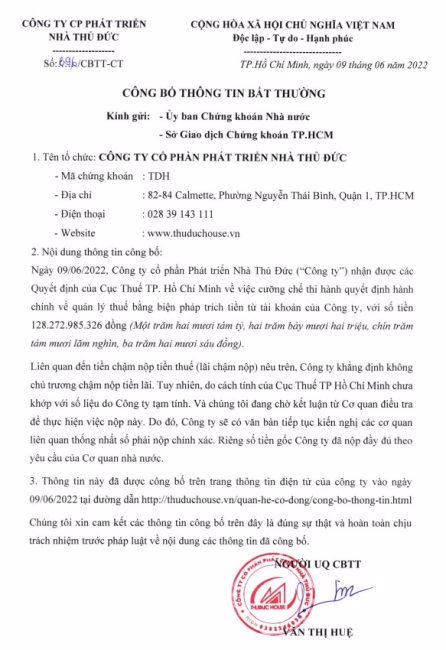 Tính từ đầu năm 2020 đến nay, công ty đã nhận liên tiếp nhiều quyết định xử phạt liên quan đến thuế từ Cục thuế TP HCM. Theo thông tin từ phiên họp thường niên trước đó, các khoản nợ gốc đã được TDH tạm nộp đầy đủ, được chia làm 3 khoản. Trong đó, 365 tỷ đồng đã được nộp vào tài khoản tạm giữ cho Cơ quan cảnh sát điều tra vào năm 2021. Sang năm nay, ThuDuc House tiếp tục nộp hai khoản gồm 20 tỷ đồng và 17 tỷ đồng theo đúng các quyết định của Cục thuế TP HCM.