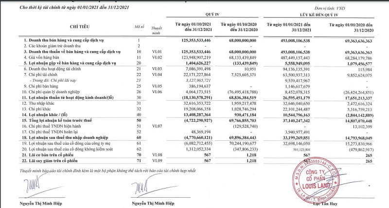 Lũy kế năm 2021, Louis Land đạt 493 tỷ đồng doanh thu thuần và 33 tỷ đồng lãi ròng, lần lượt gấp 7,1 lần và 2,1 lần kết quả 2020. Lợi nhuận đi lên chủ yếu nhờ phát sinh khoản lãi chuyển nhượng công ty 87 tỷ đồng và khoản thu nhập khác đến 33 tỷ đồng.