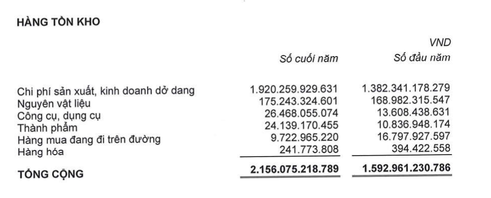 Một điểm đáng chú ý nữa là, hàng tồn kho của doanh nghiệp này liên tục tăng lên từ năm 2022 đến nay, cụ thể là tăng từ 881 tỷ đồng (năm 2022) lên 2.156 tỷ đồng (cuối năm 2024).