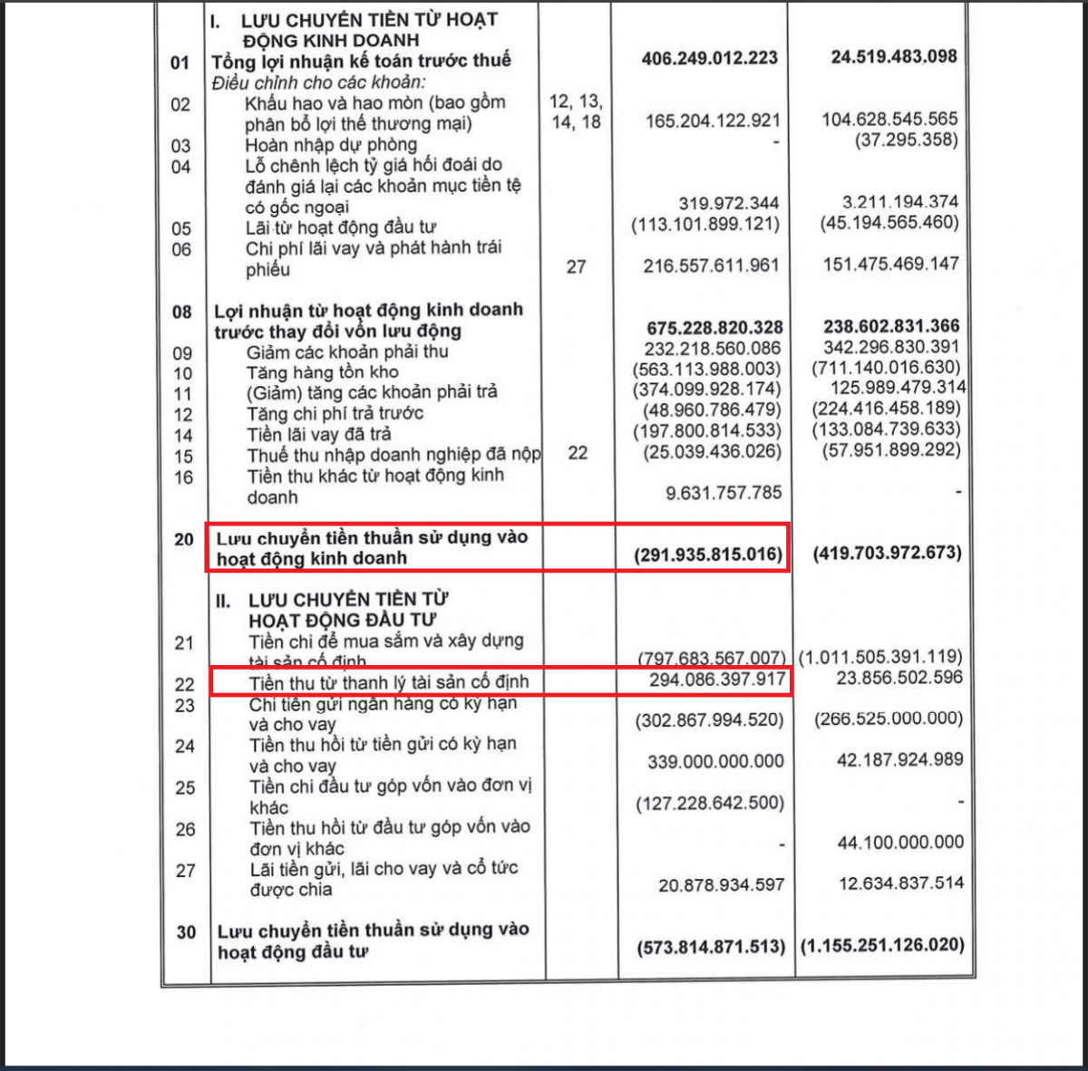 Ở khía cạnh khác, dòng tiền đầu tư cũng cho thấy việc thanh lý tài sản để thu về số tiền 476 tỷ đồng.