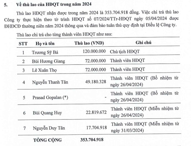 Theo đó, năm 2025, công ty dự chi 1,58 tỷ đồng để trả thù lao cho HĐQT, BKS và người phụ trách quản trị công ty. Trong đó, Chủ tịch sẽ nhận 30 triệu đồng/tháng, các thành viên khác của HĐQT nhận 18 triệu đồng/tháng.