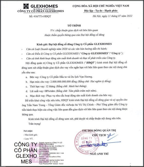 Theo đó, Glexhomes trình Đại hội đồng cổ đông xem xét chấp thuận giao dịch về việc cho công ty Vạn Hương vay 2.000 tỷ đồng, thời hạn vay là 12 tháng, lãi suất vay 8%/năm. Theo Glexhomes, mục đích của khoản cho vay là phục vụ nhu cầu hoạt động sản xuất kinh doanh của Vạn Hương.