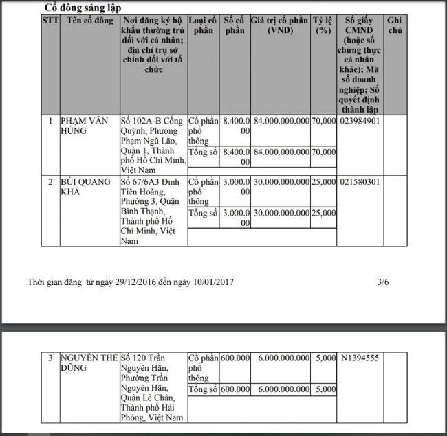Đến ngày 5/11/2020, vốn điều lệ của doanh nghiệp này tăng từ 200 tỷ đồng lên 2.682 tỷ đồng. Tuy nhiên, thông tin về các cổ đông không được công bố.