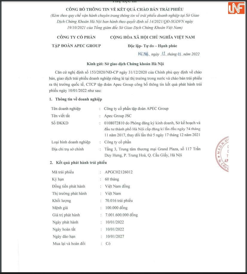Kết quả công bố sau đó cho thấy, kế hoạch huy động 3.000 tỷ đồng của Apec Group không thành công, doanh nghiệp chỉ huy động động vỏn vẹn hơn 8 tỷ đồng. Tuy nhiên, lô trái phiếu này sau đó đã bị UBCKNN ra quyết định xử phạt 600 triệu đồng và buộc thu hồi do phát hành không đúng quy định.