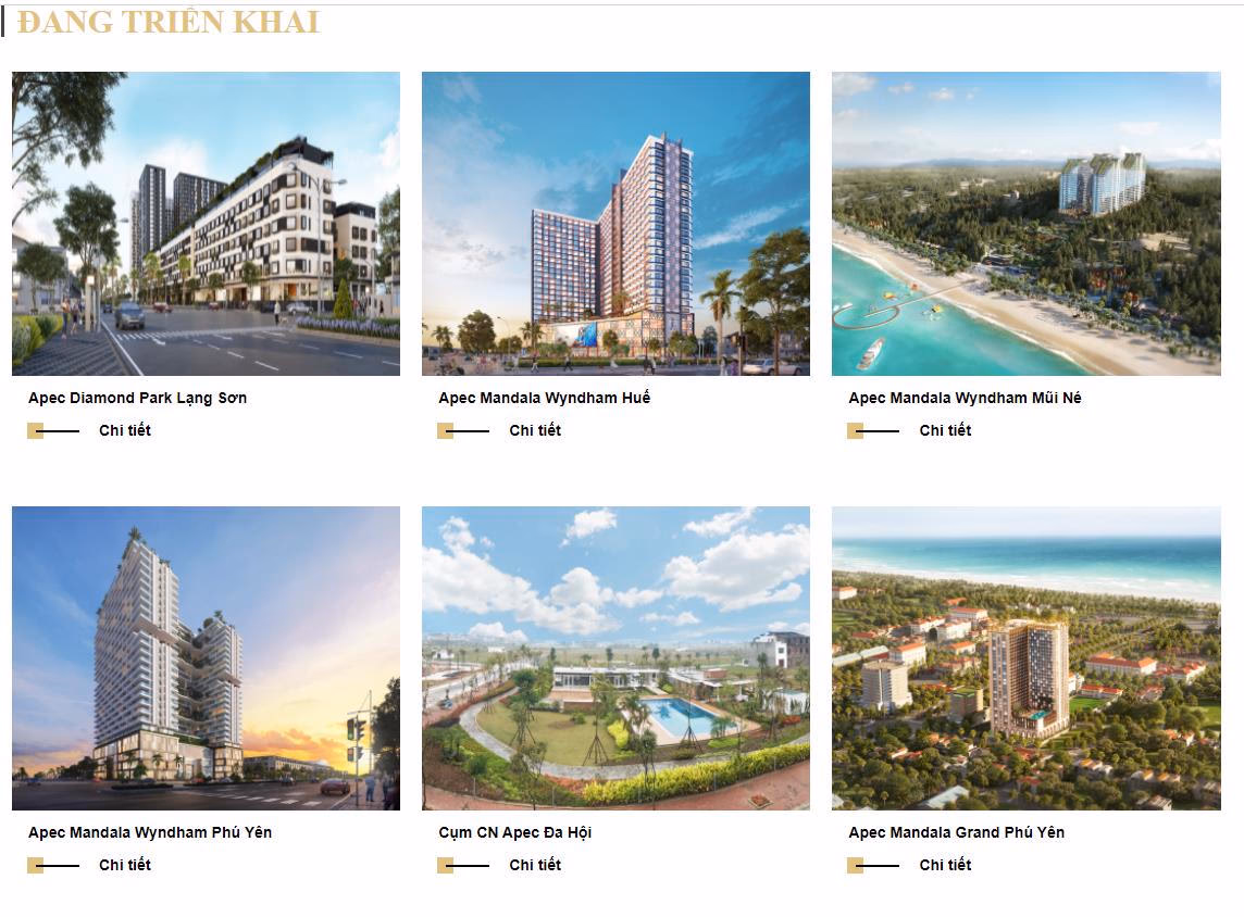 Trên thị trường bất động sản, Apec Group được biết đến là chủ đầu tư hàng loạt dự án bất động sản nghỉ dưỡng đình đám. Hiện doanh nghiệp đang triển khai loạt dự án như: Apec Mandala Wyndham Mũi Né, Apec Diamond Park Lạng Sơn, Apec Golden Palace Lạng Sơn, Apec Mandala Wyndham Huế, Apec Mandala Wyndham Phú Yên, Apec Mandala Wyndham Hải Dương, Apec Mandala Sky Villas Kim Bôi, Apec Aqua Park Bắc Giang, Apec Golden Valley Mường Lò, Apec Aqua Park Bắc Giang, Điềm Thuỵ Center Point, Cụm công nghiệp Apec Đa Hội, Apec Dubai Ninh Thuận.