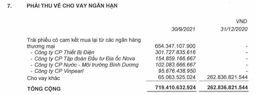 Đáng lưu ý, khoản phải thu về cho vay tăng đột biến lên 719 tỷ trong khi cuối quý II chỉ 20 tỷ đồng và đã gấp 2,73 lần so với đầu năm. Theo thuyết minh thì đây là các khoản đầu tư trái phiếu vào CTCP Thiết bị điện (Mã: THI - Thibidi), Novaland (Mã: NVL), CTCP Nước – Môi trường Bình Dương (Biwase - Mã: BWE) và Vinpearl.