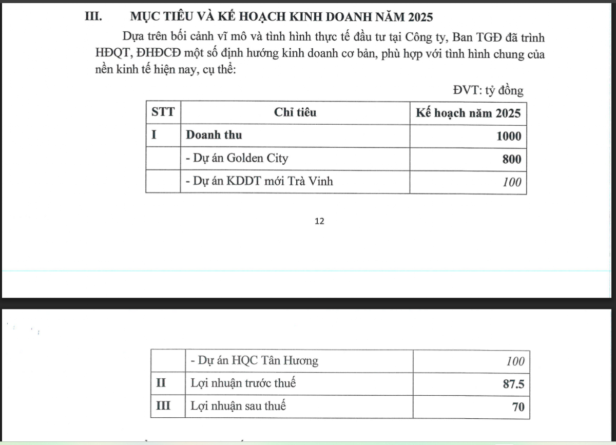 Trong năm 2025, Địa ốc Hoàng Quân đặt kế hoạch doanh thu 1.000 tỷ đồng, tăng 189,3% so với thực hiện của năm 2024. Trong đó, doanh thu dự án Golden City ghi nhận 800 tỷ đồng; doanh thu dự án HQC Tân Hương 100 tỷ đồng và dự án Khu đô thị mới Trà Vinh 100 tỷ đồng. Lợi nhuận sau thuế năm 2025 dự kiến 70 tỷ đồng, tăng 107,1% so với thực hiện trong năm 2024.