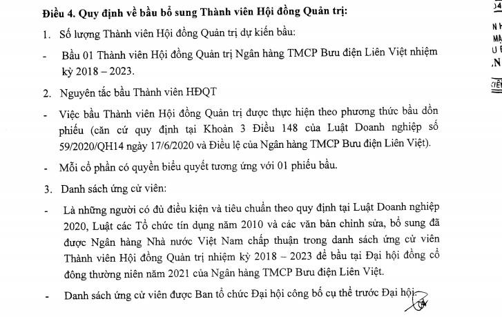 Liên quan đến tình hình nhân sự tại LienVietPostBank, theo dự thảo nội dung tại ĐHĐCĐ thường niên sắp tới, ngân hàng này sẽ tiến hành bầu bổ sung thành viên HĐQT nhiệm kỳ 2018 – 2023, tuy nhiên thông tin cụ thể về số lượng và nhân sự đề cử hiện chưa được công bố. Và theo một số nguồn tin ông Nguyễn Đức Thụy (Bầu Thụy) – người đang nắm giữ lượng cổ phiếu LPB lớn có thể được đề cử vào HĐQT của ngân hàng này tại ĐHĐCĐ sắp tới.