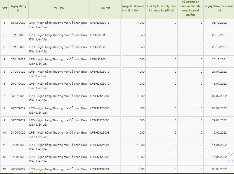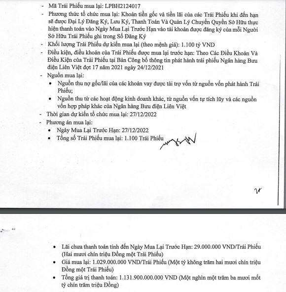 Ngày 16/12 vừa qua, Ngân hàng Thương mại Cổ phần Bưu điện Liên Việt (LienVietPostBank, HoSE: LPB) vừa công bố thông tin về đợt mua lại trái phiếu.