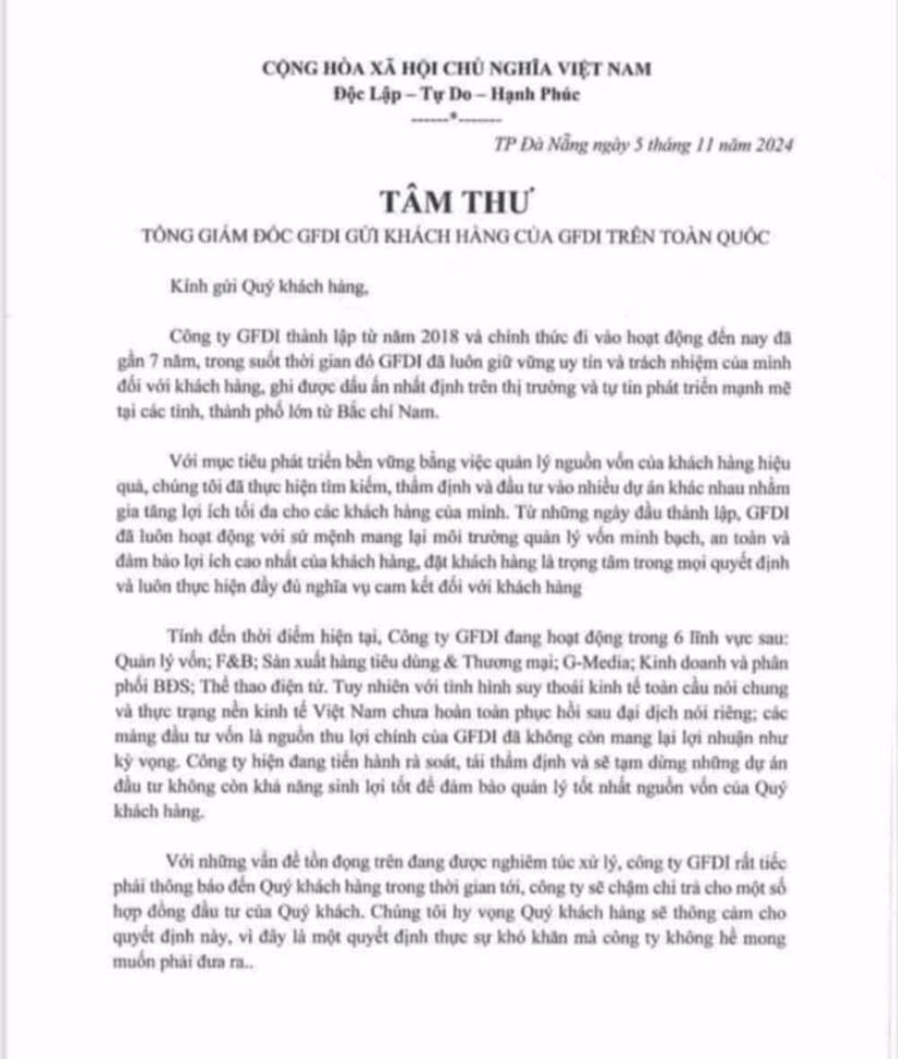 “Các mảng đầu tư vốn là nguồn thu lợi chính của GFDI đã không còn mang lại lợi nhuận như kỳ vọng”, nội dung tâm thư của Công ty GFDI nêu.