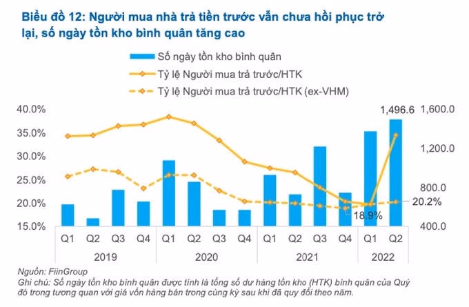 Theo báo cáo tổ chức này, trong quý 2/2022, doanh thu của 54 doanh nghiệp bất động sản niêm yết ghi nhận giảm 49%, lợi nhuận ròng giảm hơn 70%. Đáng chú ý nhất trong báo cáo của Fiin Ratings là chỉ số vòng quay hàng tồn kho ở các doanh nghiệp bất động sản niêm yết đã đạt mức đáng báo động 1.497 ngày, tương đương gần 4 năm, cao nhất trong lịch sử. Con số này đã tăng mạnh so với thời điểm cuối năm 2021, và gần gấp đôi so với giai đoạn 2019 - 2020.